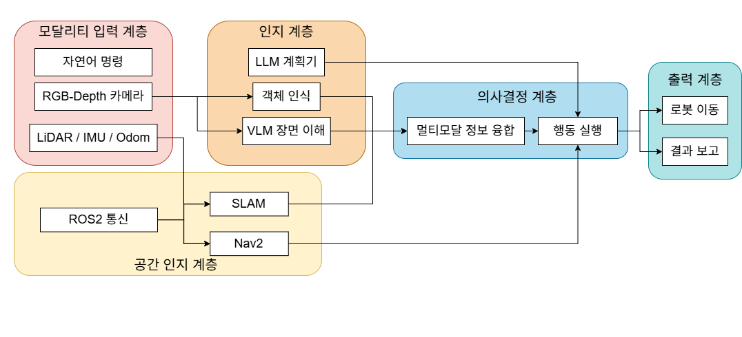 https://youtu.be/2mRpJeysa7Y 이번 프로젝트에서는 장면이해, 자율주행, 상황인식, 언어 명령 이해를 하나로 묶은 멀티모달 서비스 로봇 시스템을 구현했다.단순히 “목표 지점까지 이동하는 로봇”이 아니라, 사용자의 자연어 명령을 이해하고, 객체 탐지를 통해 위험성을 판단하면서 집 안을 이동한 뒤, 카메라로 주변을 확인하고, 그 결과를 다시 사용자에게 전달할 수 있는 형태를 목표로 했다.예를 들면 이런 식이다.“엔드포인트로 가서 뭐가 보이는지 알려줘”“현관으로 가서 문이 닫혀 있는지 확인해줘”“집으로 다시 돌아와”이런 요청을 로봇이 받아서,어디로 이동해야 하는지 결정하고,실제로 자율주행을 수행하고,도착 후 현재 장면을 인식하고,결과를 텍스트로 보고하는 흐름이다.겉으로 보기에는 단순한 서..