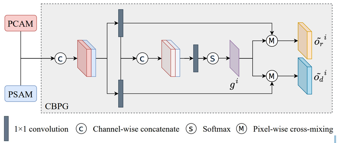 CBPG 내부에서는 픽셀 단위의 gating 메커니즘이 사용됩니다. 이때 생성되는 게이트 값은 특정 위치가 중요한지 여부를 나타내는 attention map과는 성격이 다릅니다. CBPG의 gating 결과는 각 픽셀에서 RGB와 Depth 중 어느 정보를 더 신뢰할 것인지를 나타내는 값으로 해석하는 것이 적절합니다.