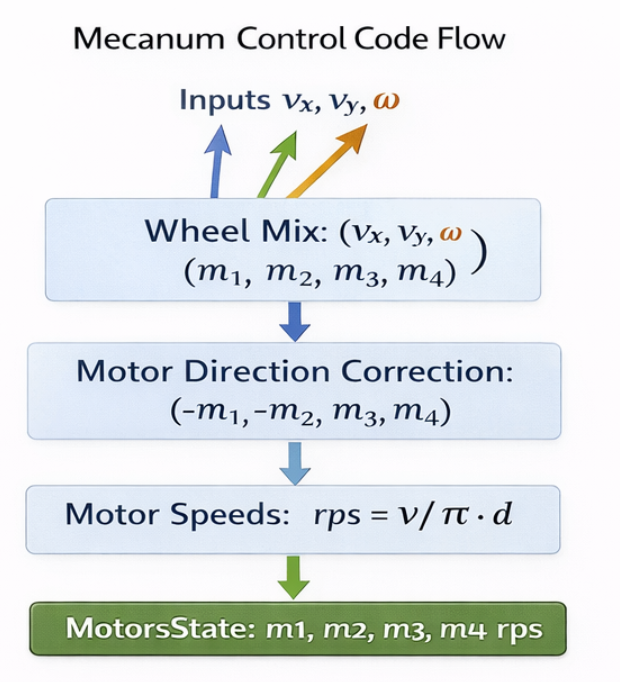 즉, 바퀴 회전 속도를 조합하면 vx,vy,ωv_x, v_y, \omega를 동시에 만들 수 있습니다.