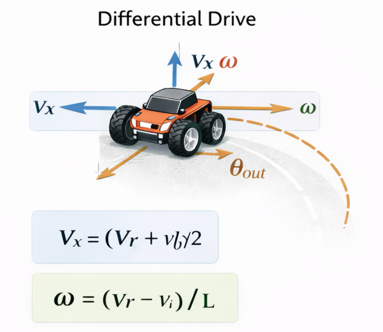 이상적인 모델은 Differential과 유사하지만, 실제 주행에서는 바닥 마찰과 슬립이 개입할 수 있습니다.