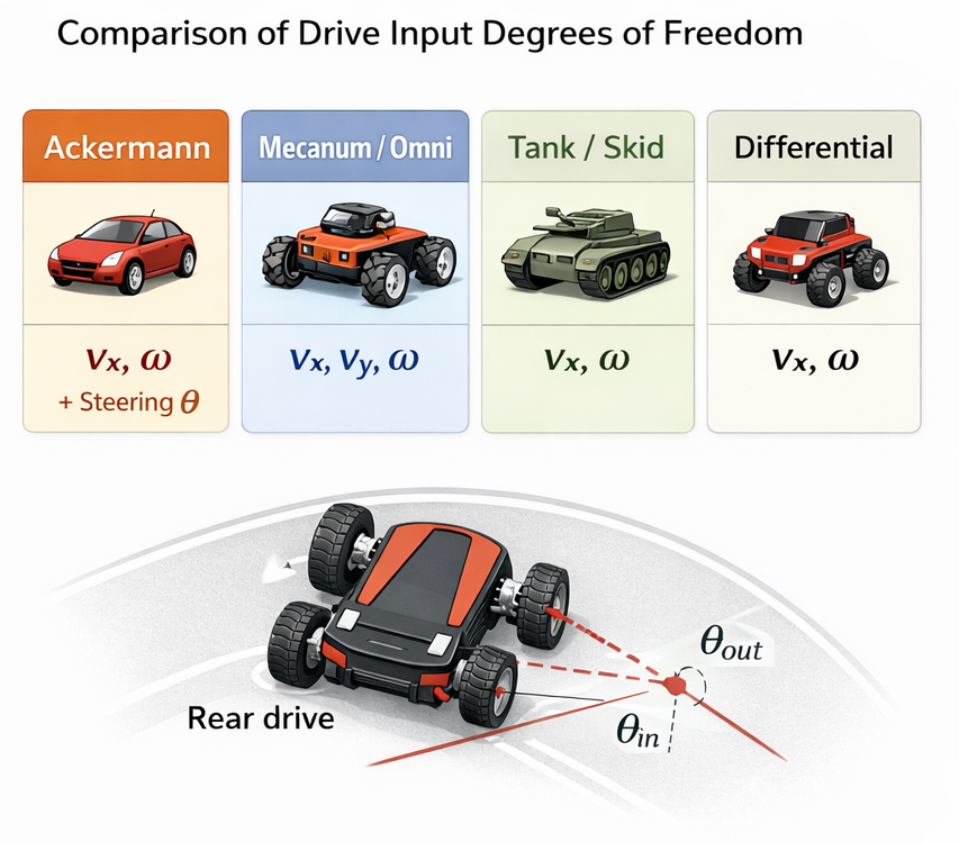 구동 방식의 차이는 이 세 값을 “바퀴/트랙/조향각”으로 바꾸는 운동학(kinematics)이 다르다는 뜻입니다.