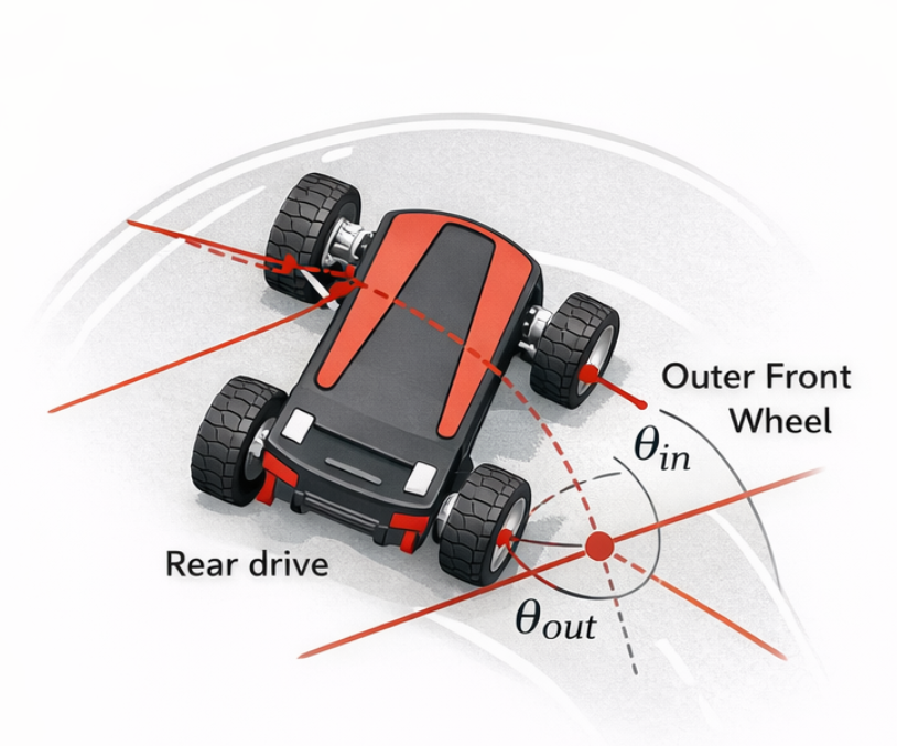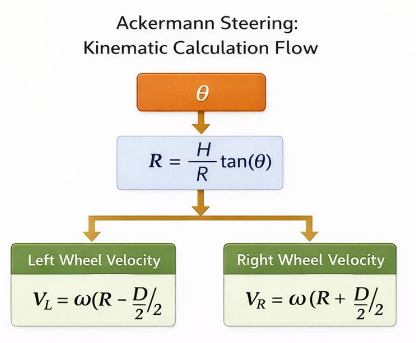 정리하면 “조향각이 주어지면 회전 반경이 정해지고, 그로부터 좌/우 바퀴 속도가 갈라진다”가 핵심입니다.
