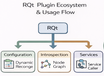 RQt는 Qt 기반 GUI 프레임워크이면서, 여러 디버깅 도구가 플러그인으로 묶여 있습니다. 한 창에서 노드 그래프, 토픽 모니터링, 플롯 등을 조합해 쓰는 형태입니다. (필요하면 플러그인 자체를 개발하는 것도 가능합니다.)