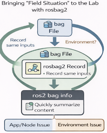 rosbag2는 토픽 데이터를 기록하고(play) 다시 재생할 수 있습니다. 디버깅에서 제일 큰 장점은 같은 입력을 여러 번 반복할 수 있다는 점입니다.