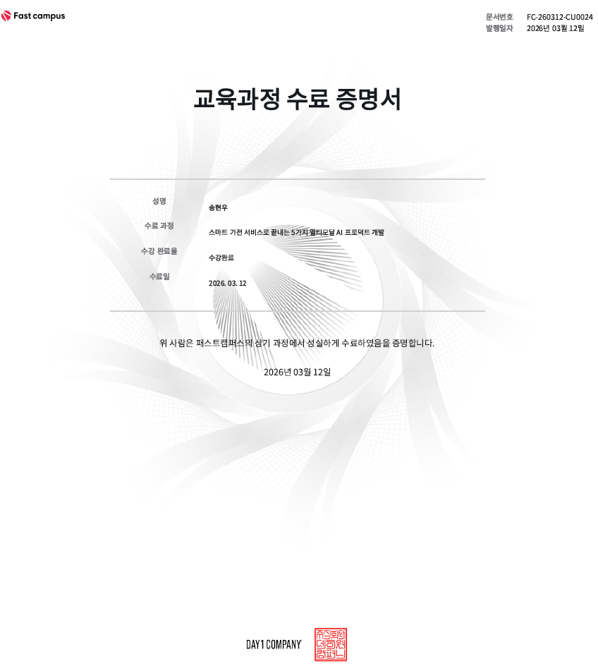 - ์ค๋งํธ ํ·๊ฐ์ ์๋น์ค ๊ตฌํ์ ๋ชฉํ๋ก, GPT-4 Vision·CLIP·Vector DB·LangChain·Multimodal LLM ๋ฑ ๋ฉํฐ๋ชจ๋ฌ AI ํต์ฌ ๊ธฐ์ ์ ์ค์ ํ์ฉ ๋ฐฉ๋ฒ ํ์ต
