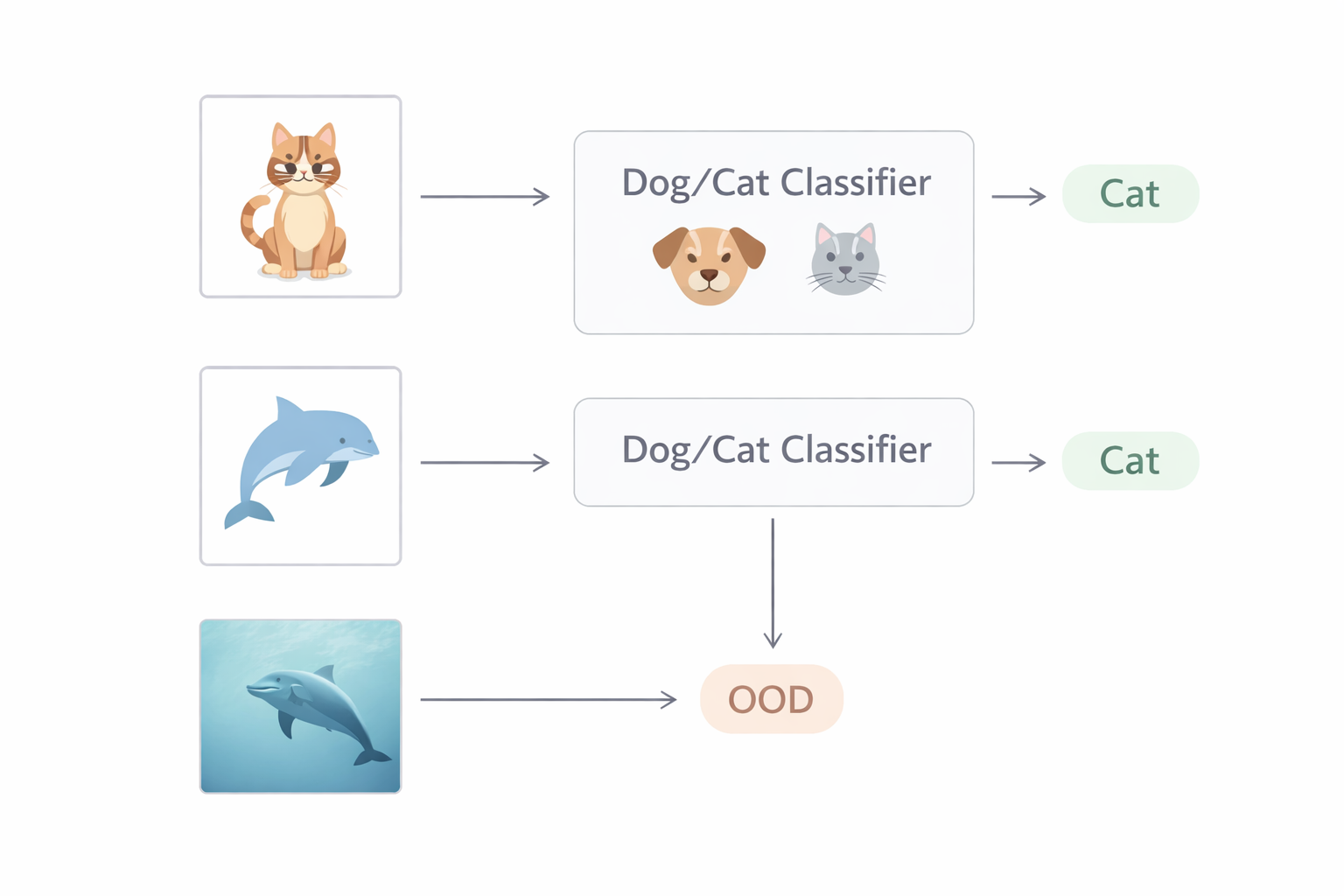 바로 이 상황이 OOD 문제의 핵심입니다. 문서에서는 학습 데이터와 유사한 샘플을 in-distribution, 학습에 없던 분포의 샘플을 out-of-distribution이라고 설명하고, 개·고양이 분류기에 돌고래가 들어왔을 때 OOD 클래스로 따로 다뤄야 한다는 예시를 제시한다.